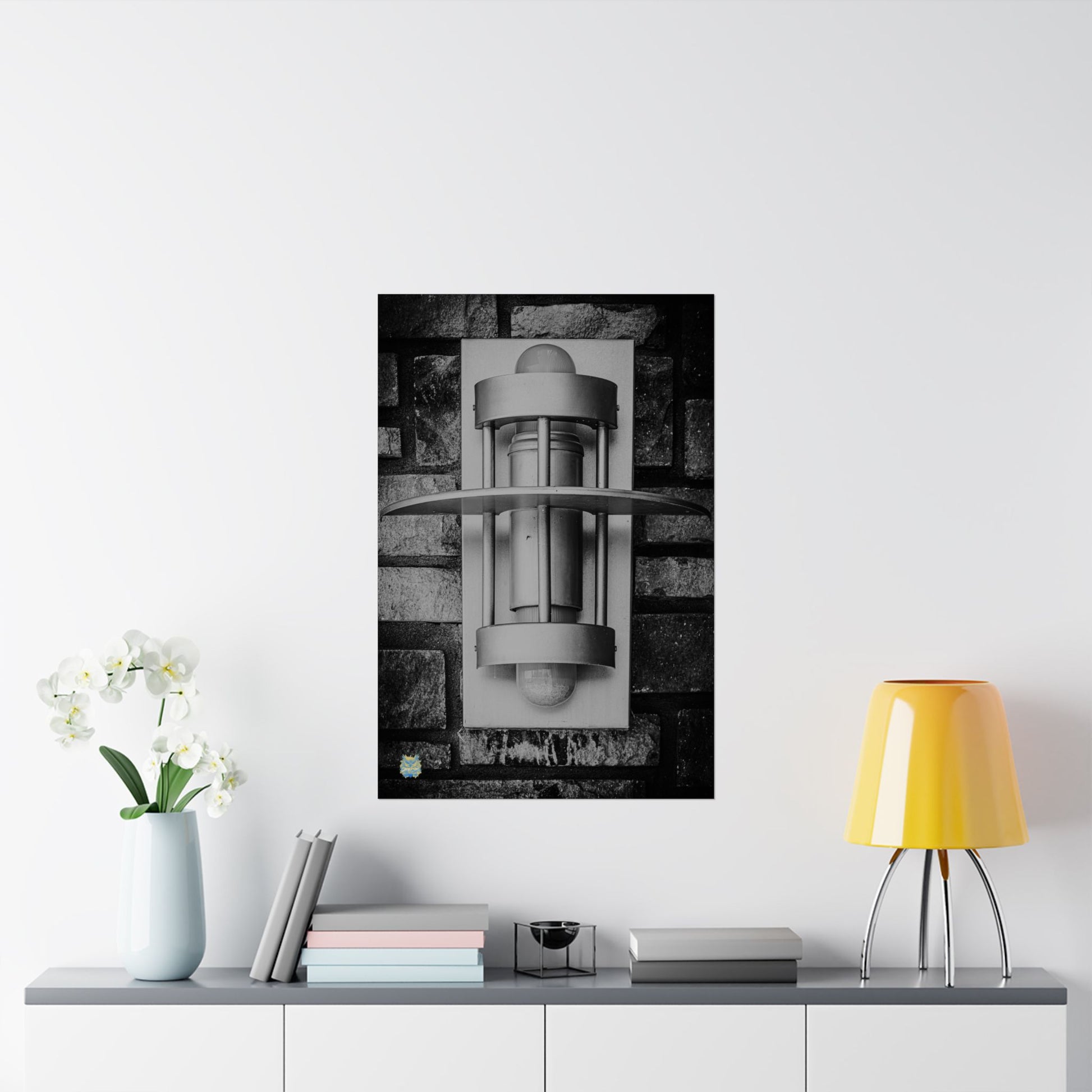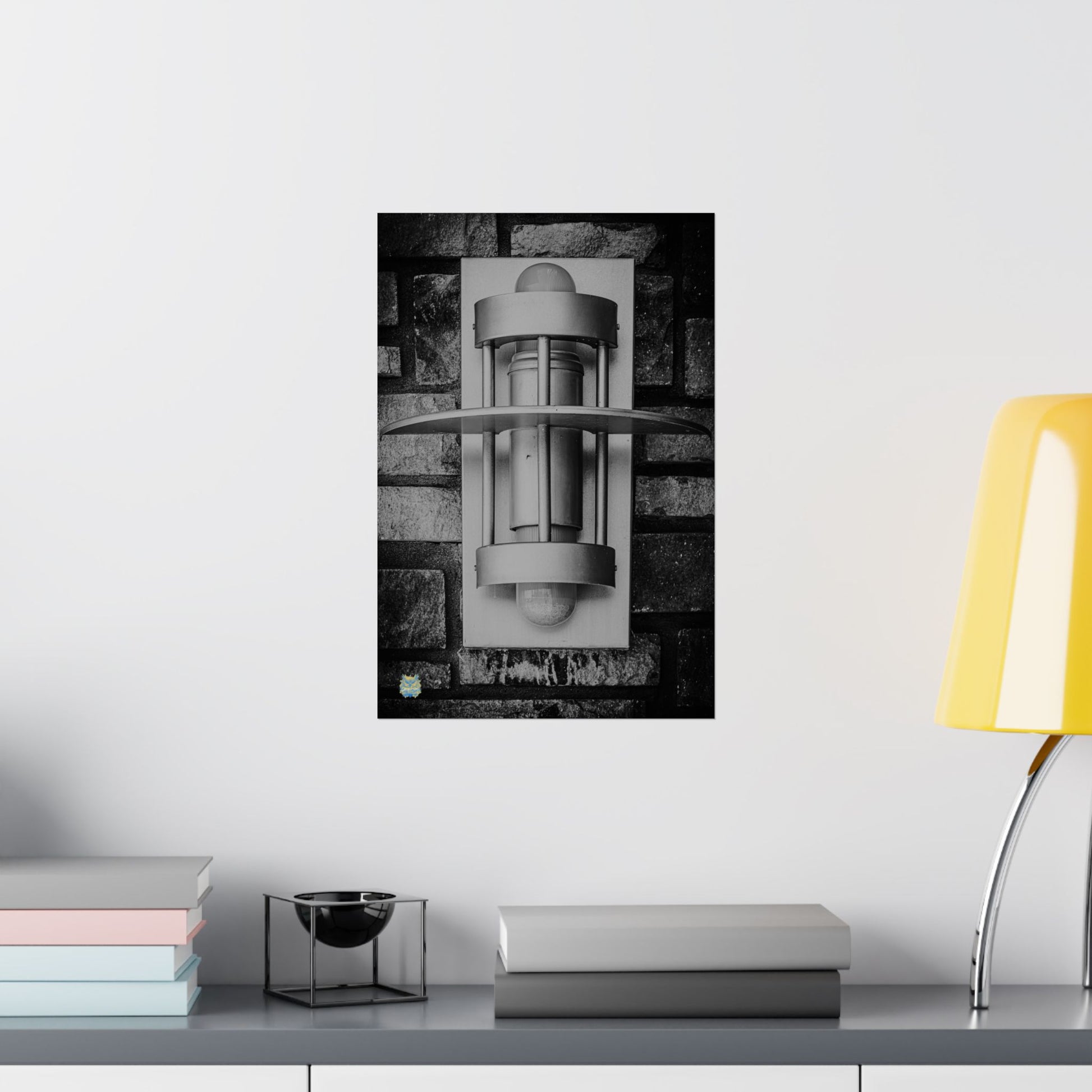 "Architectural Glow" presents a stark and striking black-and-white study of industrial design. Centered against a rugged stone backdrop, a modern exterior light fixture becomes a sculptural focal point. With clean lines, subtle symmetry, and a weathered steel aesthetic, this print balances hard geometry with artistic intrigue.