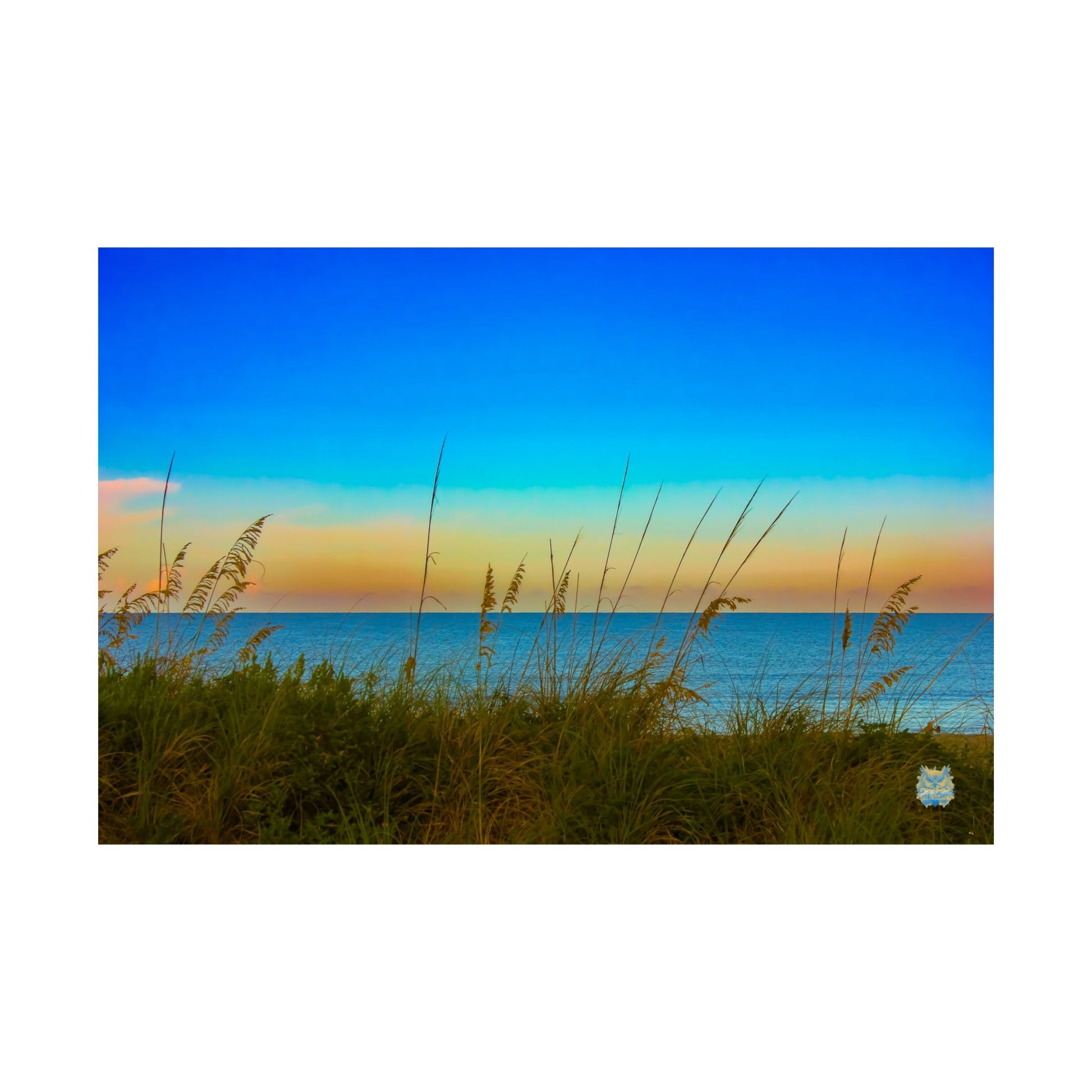 "Coastal Tranquility" captures the quiet elegance of the shore at golden hour, where tall dune grasses sway gently against a symphony of sky and sea. The horizon melts from soft amber to vibrant blue, evoking calm, clarity, and the infinite rhythm of the tide. This minimalist seascape invites viewers to pause, breathe, and drift into a state of natural serenity.