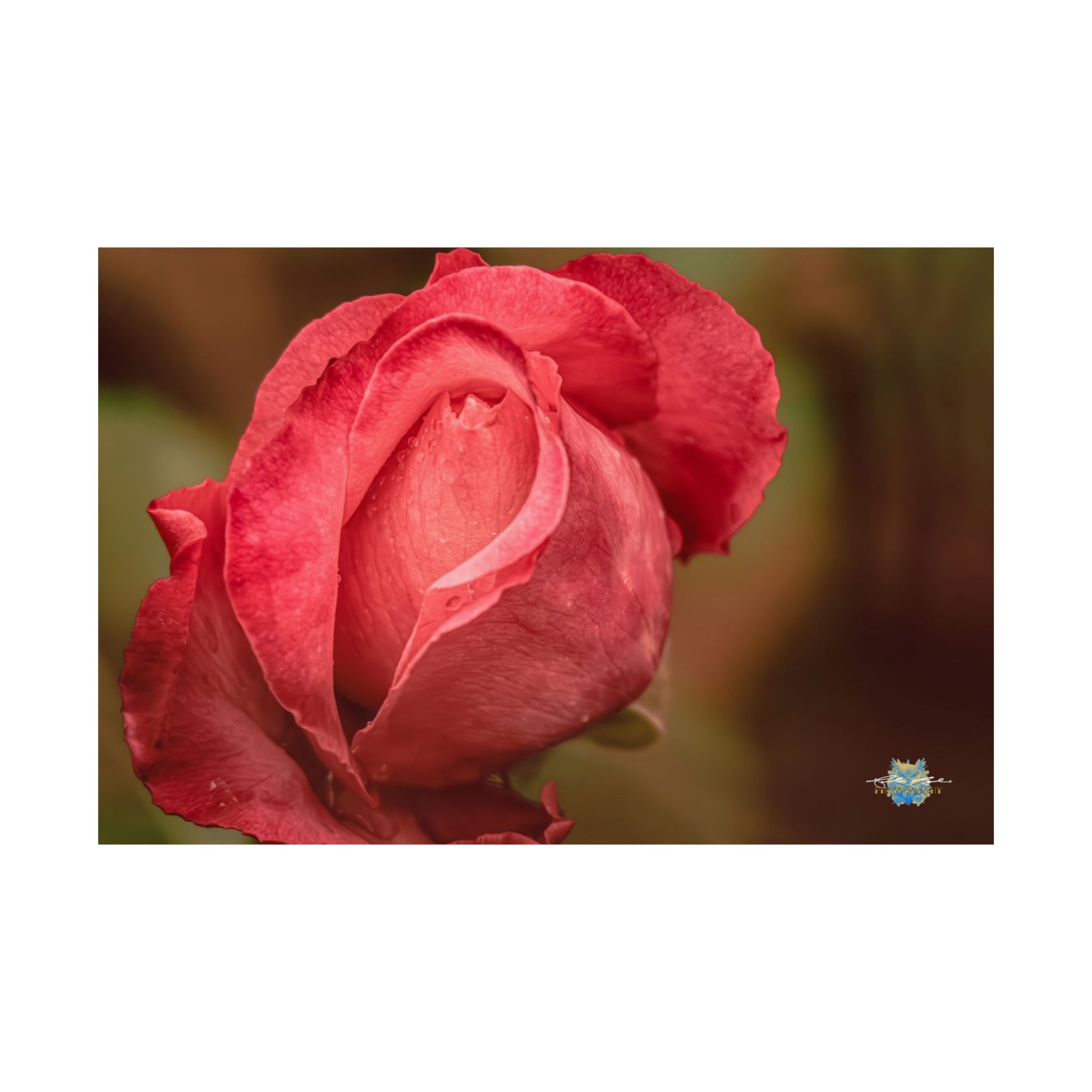"Crimson Whisper" gently captures the delicate beauty of a rose unfurling into bloom. Petals bathed in velvety shades of crimson and soft pink gracefully curve inward, holding delicate droplets of moisture—capturing a fleeting moment of gentle vulnerability and natural elegance.