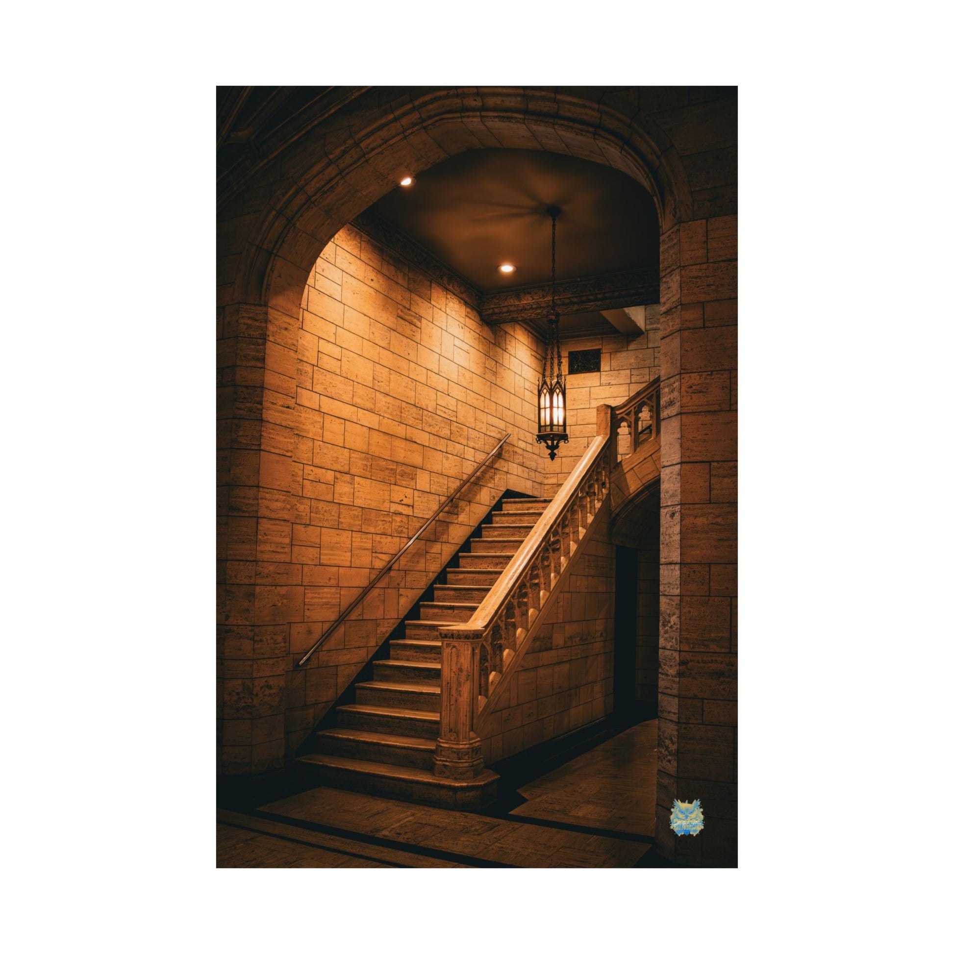 "Echoes of Elegance" draws you into a scene suspended in quiet grandeur, where warm amber light meets intricate stonework and a softly curving staircase invites the imagination upward. This captivating architectural portrait blends Gothic charm with cinematic mood, illuminated by a glowing pendant lantern that casts soft shadows across the textured walls.