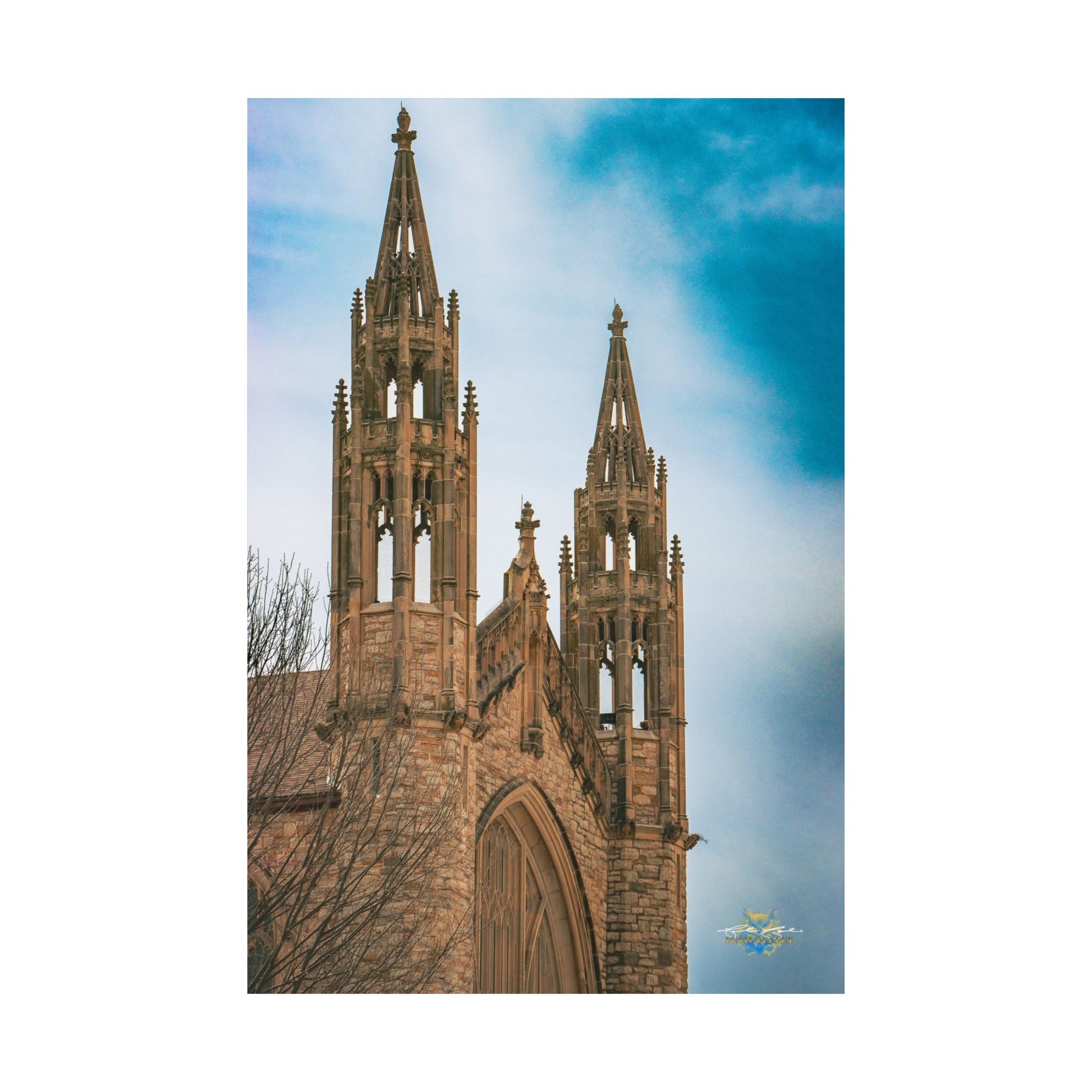 "Heavenward" captures the awe-inspiring elegance of gothic architecture rising into a vast sky. The twin spires, intricately carved and weathered with grace, stretch skyward with sacred symmetry — a tribute to craftsmanship, faith, and the endurance of sacred spaces. The golden stone facade glows softly against the cool tones of the sky, creating a striking contrast that evokes both peace and power.