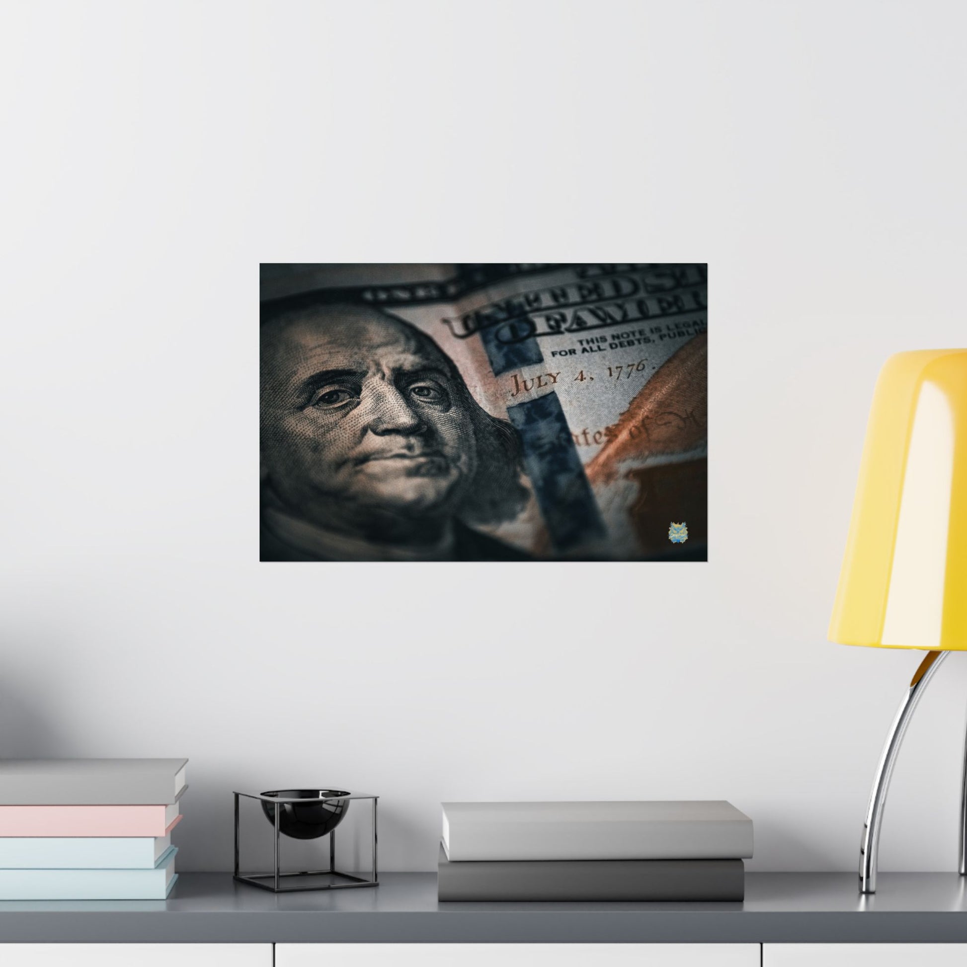 "Liberty in Detail" captures an intimate, macro perspective of one of America's most iconic symbols: the face of Benjamin Franklin as it appears on the $100 bill. The texture, ink, and engraving come alive in high resolution, drawing your attention to the historic date "July 4, 1776"—a nod to the nation’s founding moment. This striking close-up goes beyond currency, becoming a bold visual statement about history, influence, and the enduring legacy of freedom.