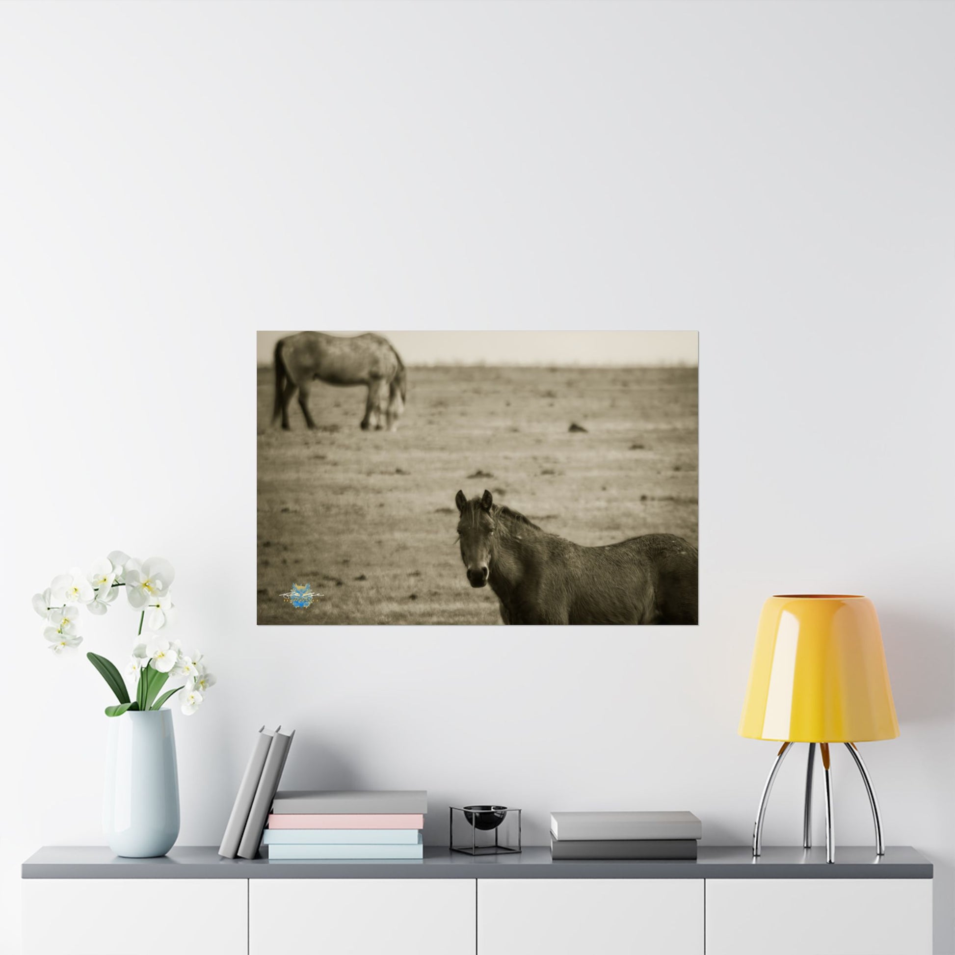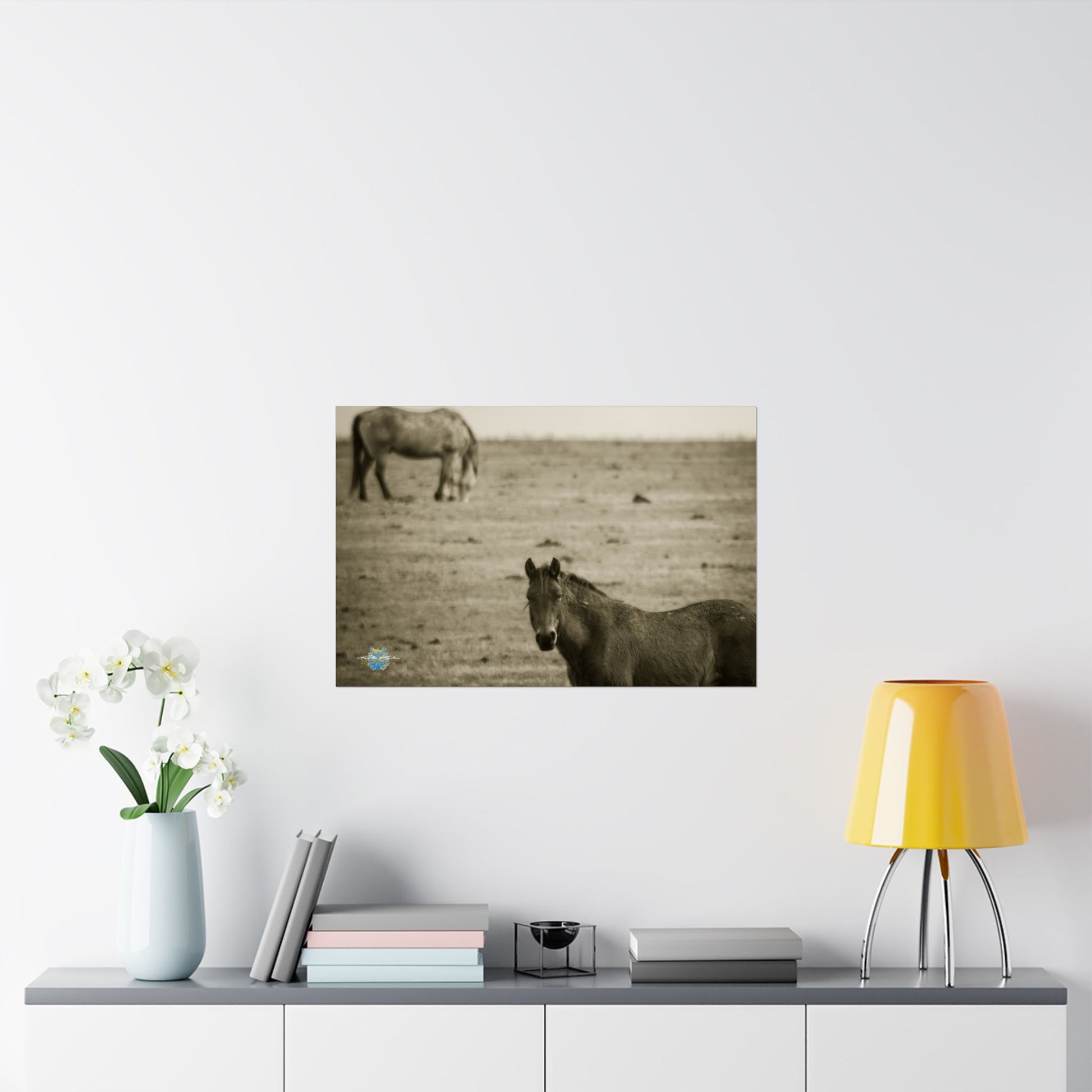 "Prairie Dreams" captures the gentle spirit of horses amid wide-open plains, rendered beautifully in warm, nostalgic sepia tones. The soft focus creates a dream-like atmosphere, inviting viewers to pause and reflect on simpler, quieter moments. One horse gazes curiously toward the viewer, establishing a personal connection, while another grazes peacefully in the distance—symbolizing freedom and tranquility.