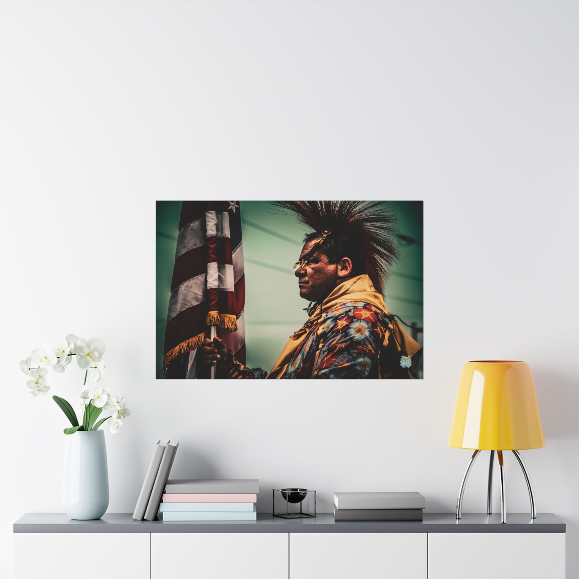 This compelling portrait freezes a moment of deep resilience and cultural pride. Featuring an Indigenous man in full regalia holding the American flag, the image tells a layered story—of identity, strength, and remembrance.