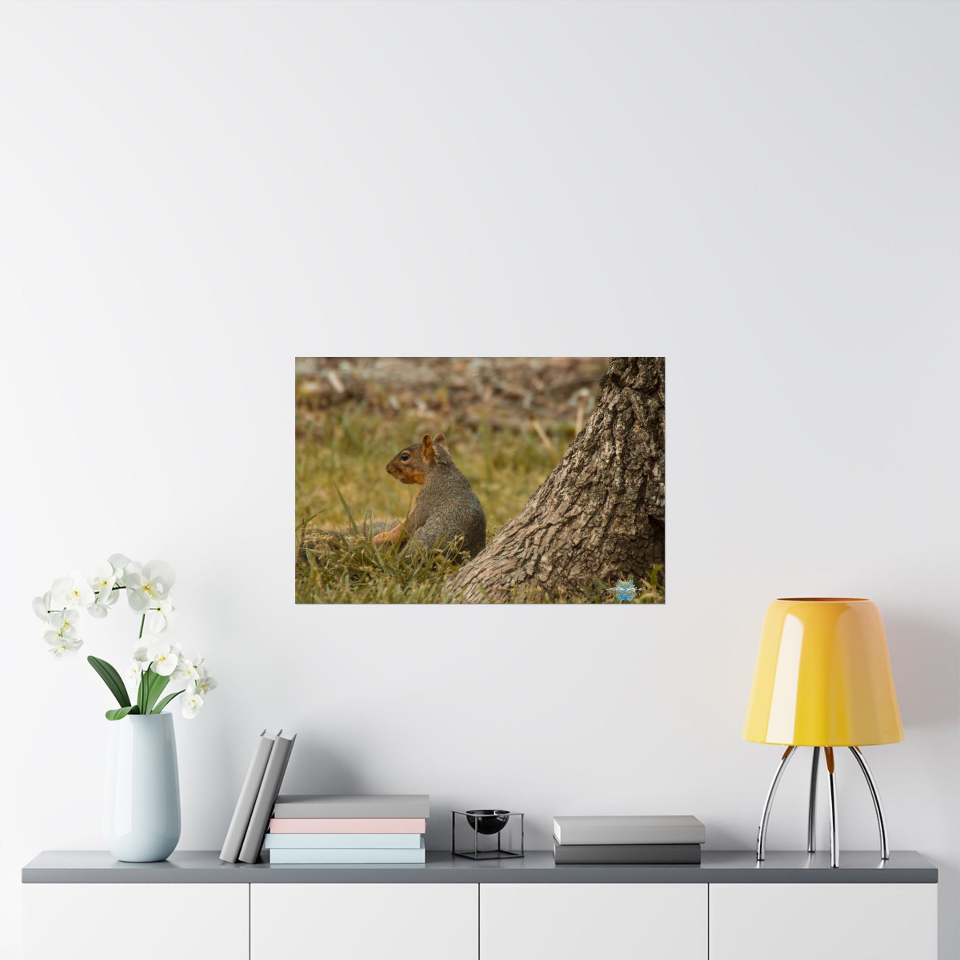 "Stillness Under the Tree" captures a quiet, intimate moment in the life of a squirrel, nestled in the grass beside a textured tree trunk. With its curious posture and soft gaze, the little creature appears deep in thought, surrounded by the earthy tones of a serene woodland setting.