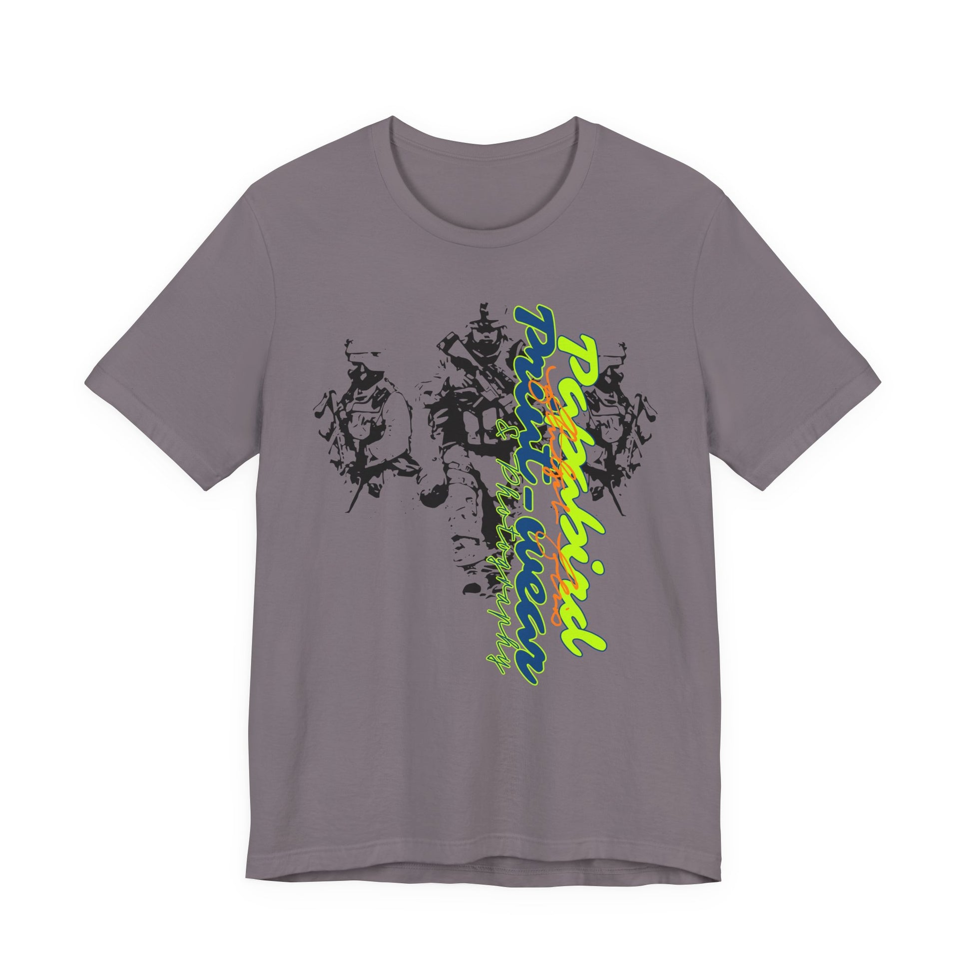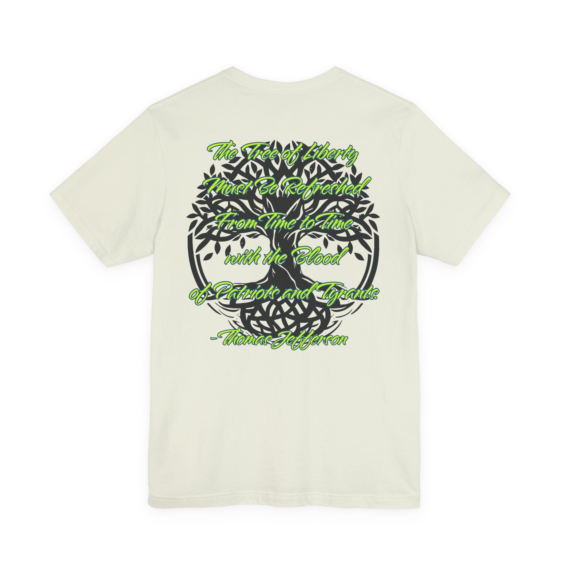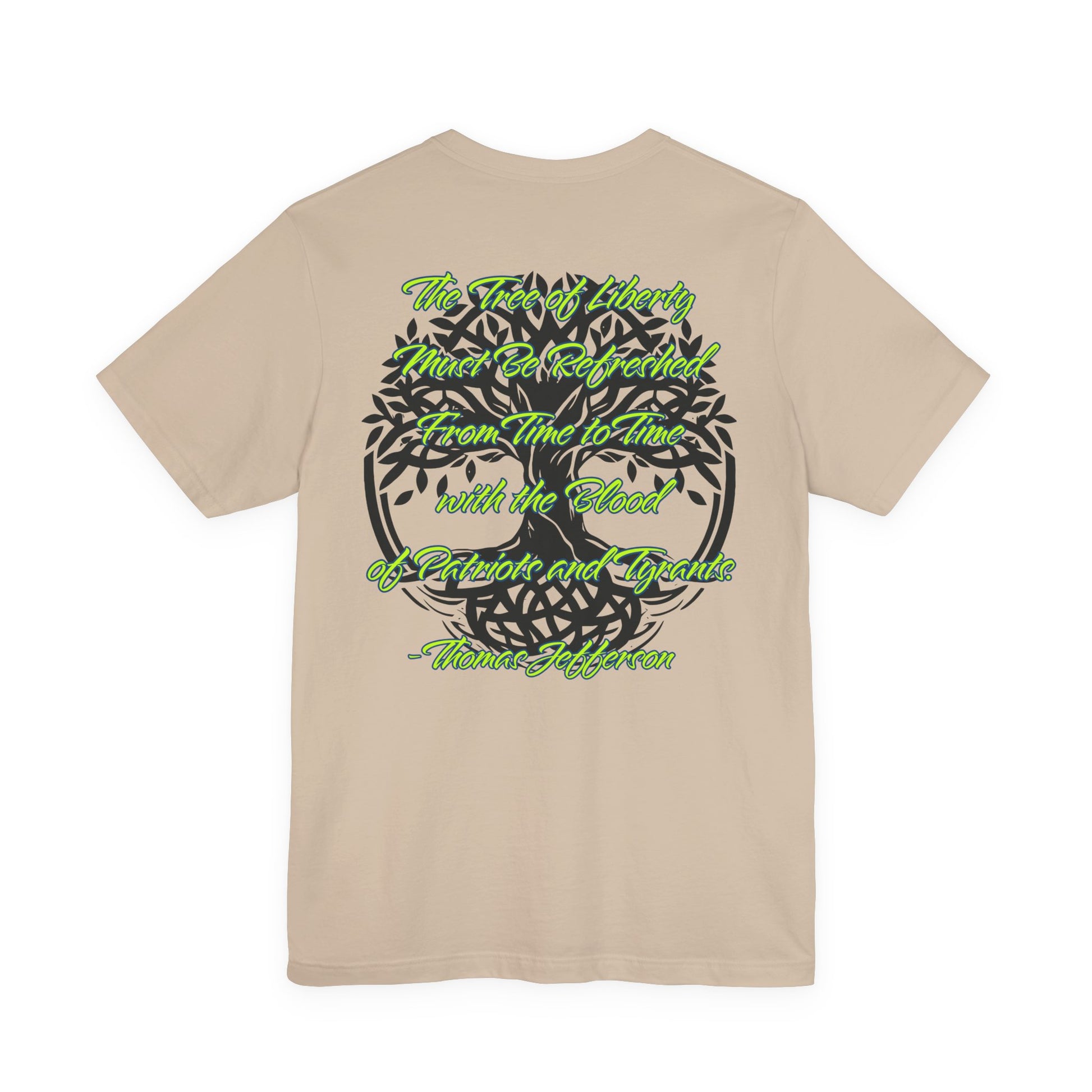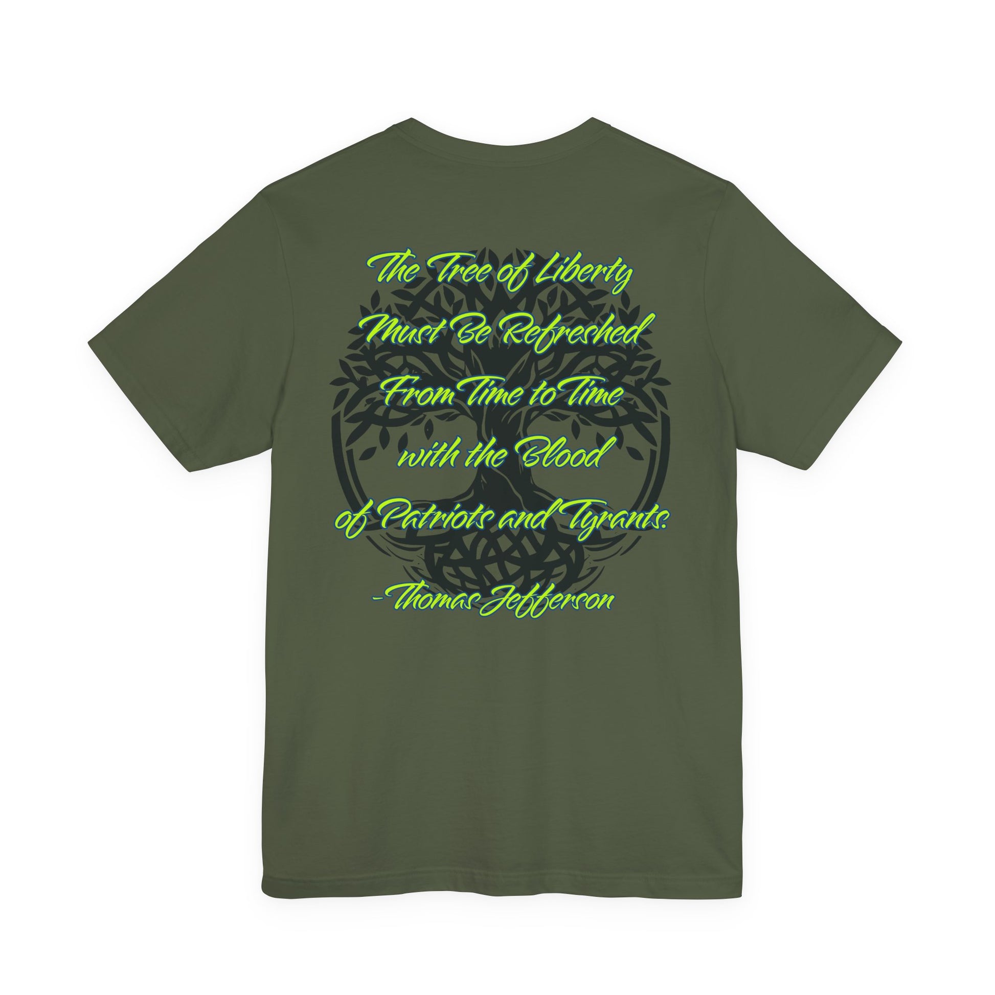 Show your bold attitude with the "Tree of Liberty Graphic Tee" Graphic-T. Crafted from soft, breathable cotton, this casual tee features a a bold military-inspired graphic of soldiers in black stencil-style art, overlaid with striking neon text. The design evokes strength and resilience while maintaining a stylish, urban aesthetic. On the back, a large tree graphic serves as the backdrop for an iconic quote from Thomas Jefferson: