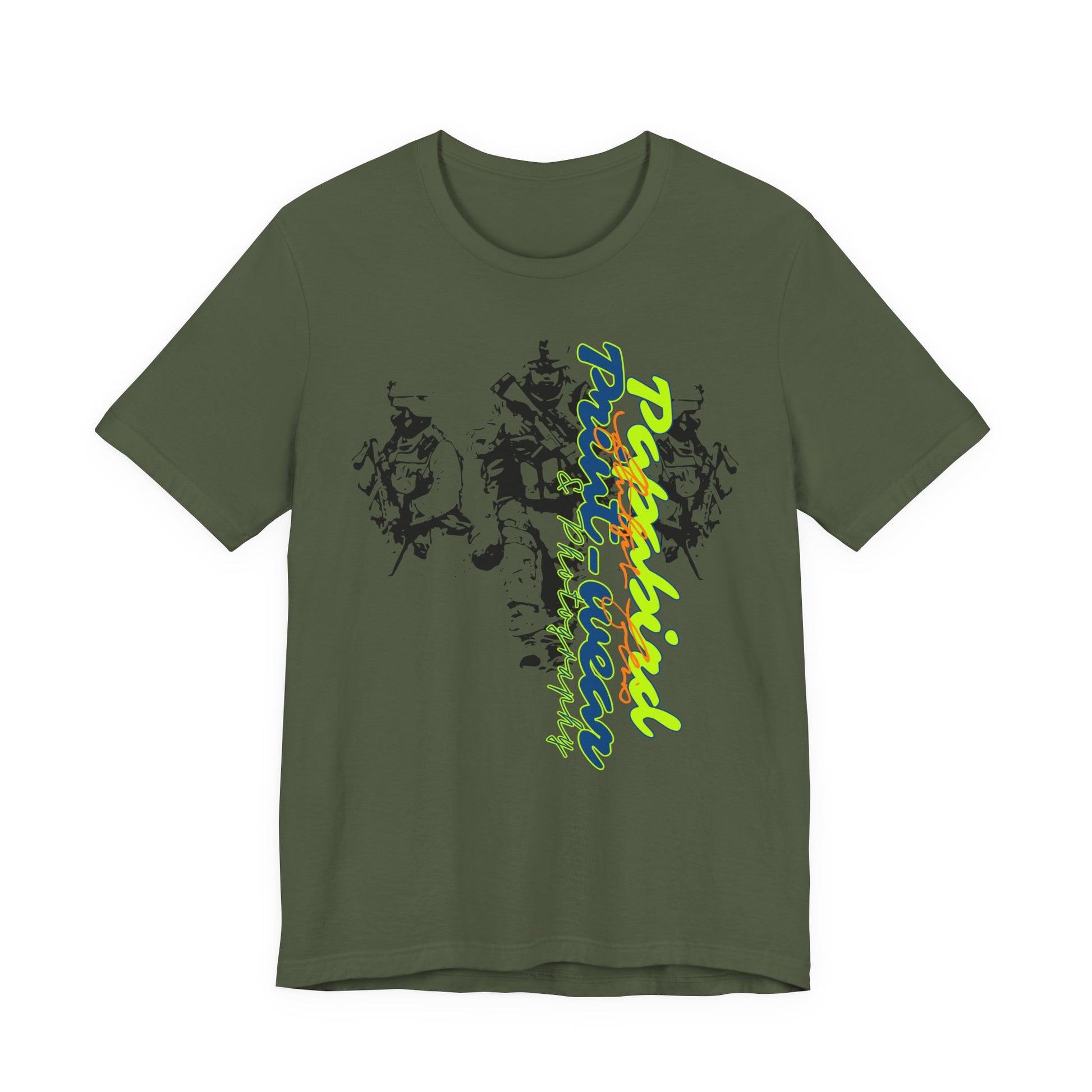 The quote is written in the same neon-inspired lettering, giving the shirt a rebellious and thought-provoking edge.