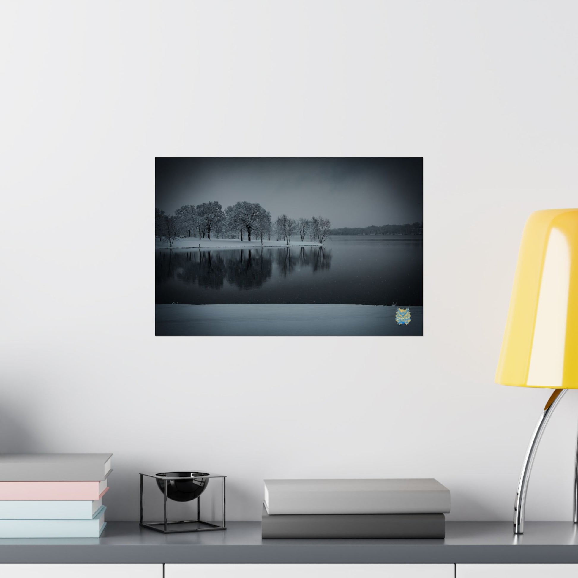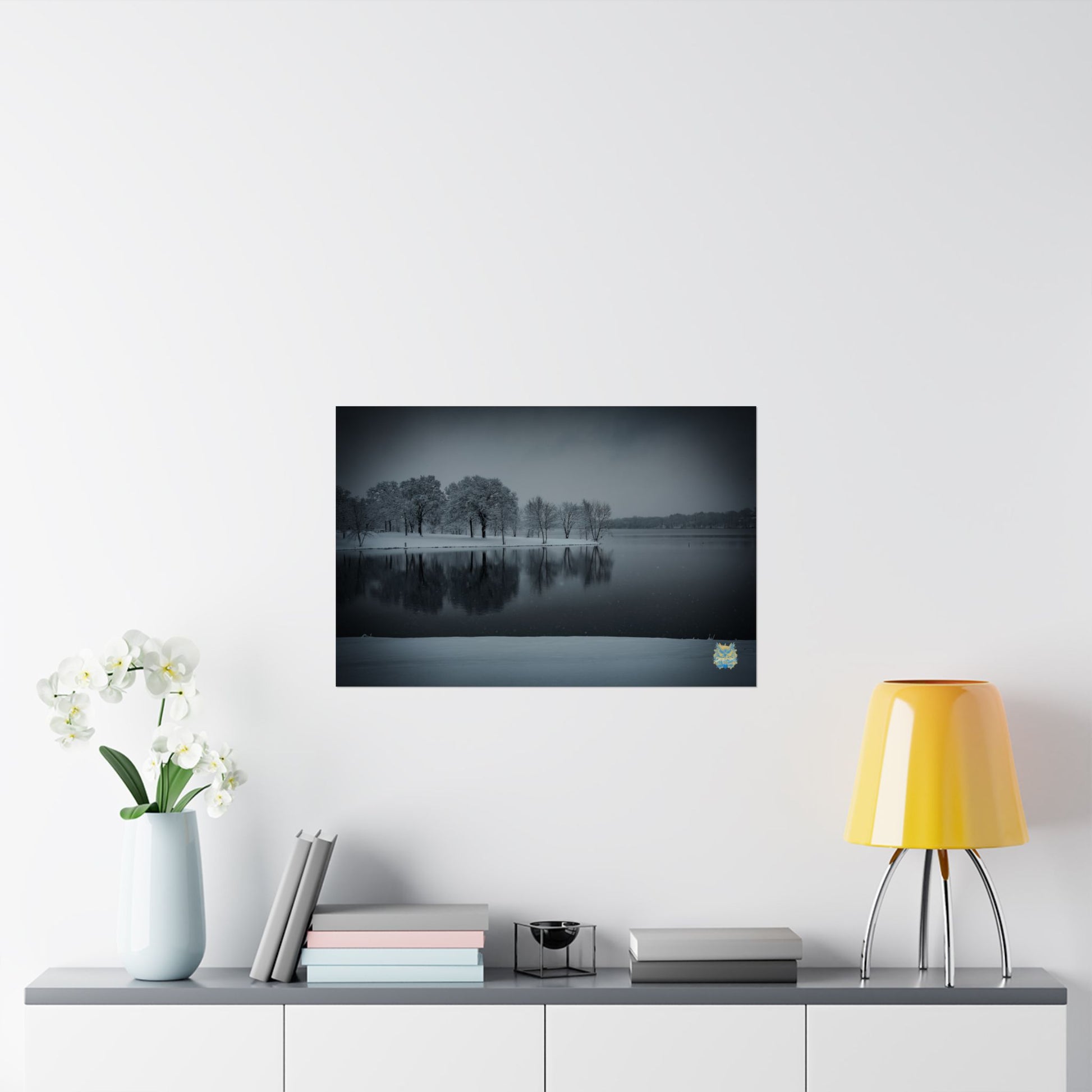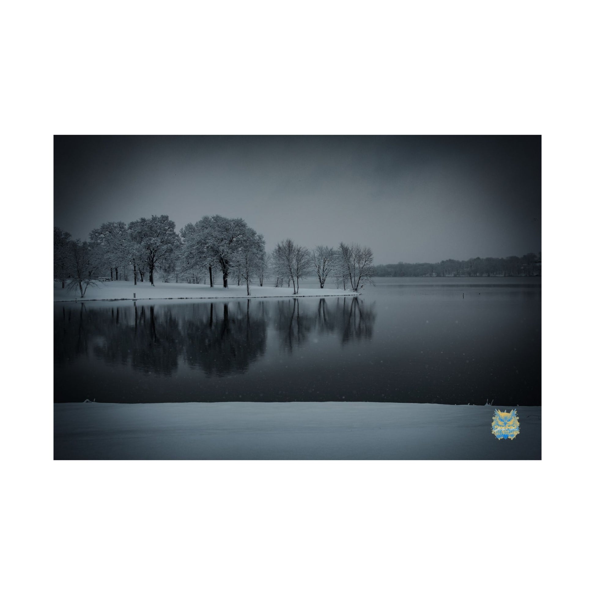 "Winter Silence" captures a breathtaking moment of calm as snow gently blankets a lakeside grove. Bare trees, cloaked in frost, stand reflected in still, inky waters—creating a mirror of quiet beauty and solitude. Soft snowfall drifts through the air, and a dreamy, misted background blurs the horizon, enhancing the image’s poetic sense of peace.